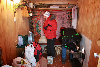 Serozhya and Tanya preparing the stove to warm up the banya. This is the entrance room, the coolest one where you undress and rest after bathing